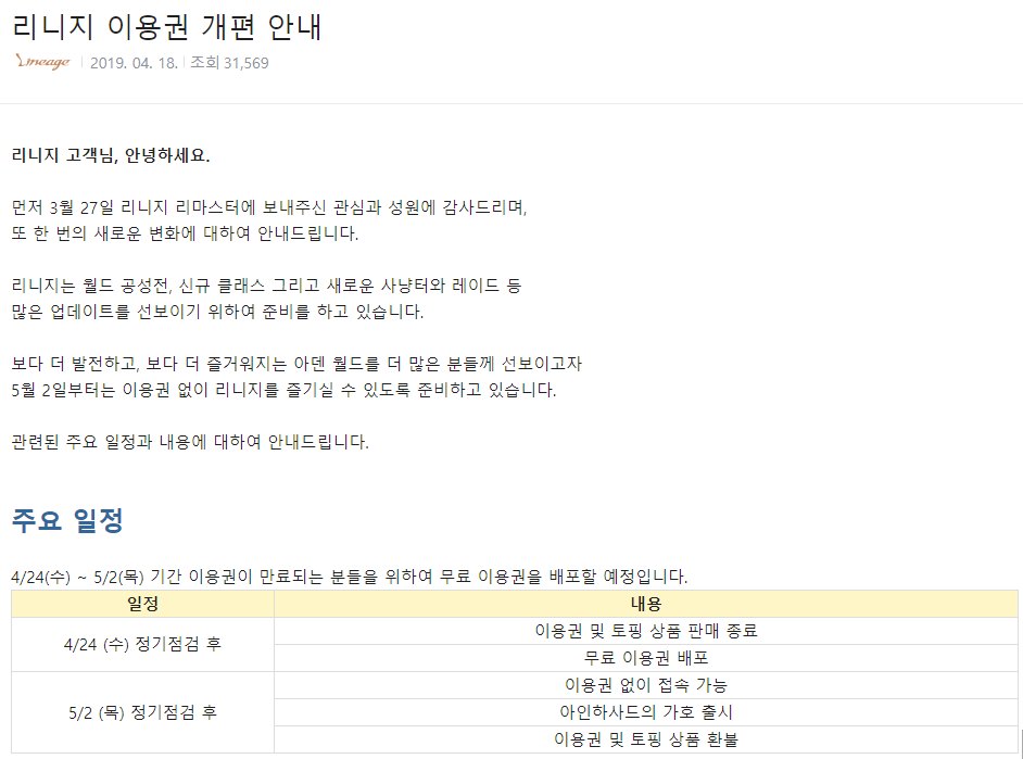 ์๋๋ ๊ณต์์ฌ์ดํธ์ ์ฌ๋ผ์จ ๊ณต์ง์ ๋๋ค. https://lineage.plaync.com/board/notice/view?articleId=4091975