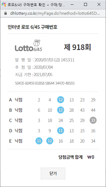 ๋ก๋ 918ํ ๋น์ฒจ๋ฒํธ 7 11 12 31 33 38 ๋ณด๋์ค 5